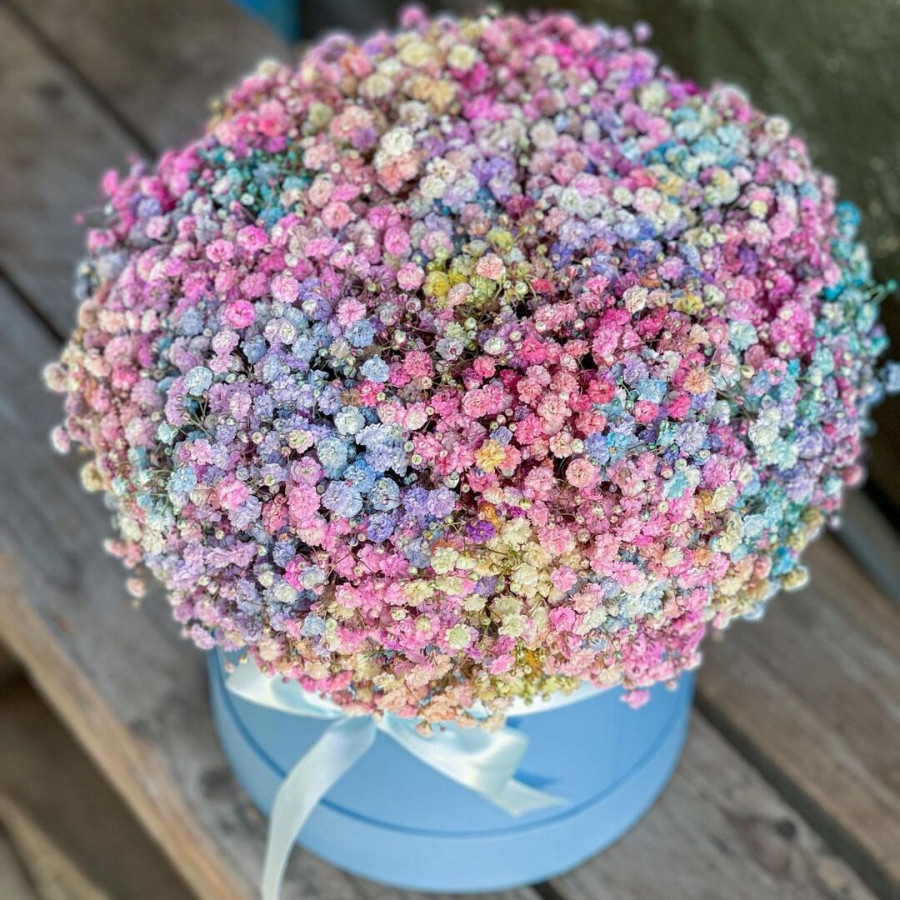 Очаровательный букет "Разноцветные гипсофилы в голубой шляпной коробке" - это настоящая симфония красок и нежности. В этом букете вы найдете 25 изящных гипсофилов разных оттенков, создающих яркое и живописное сочетание цветов. Они уютно расположены в голубой шляпной коробке, придающей им особый шарм и элегантность. Этот букет станет прекрасным подарком для выражения любви, дружбы или благодарности. Создайте волшебное настроение с нашими разноцветными гипсофилами в голубой шляпной коробке.