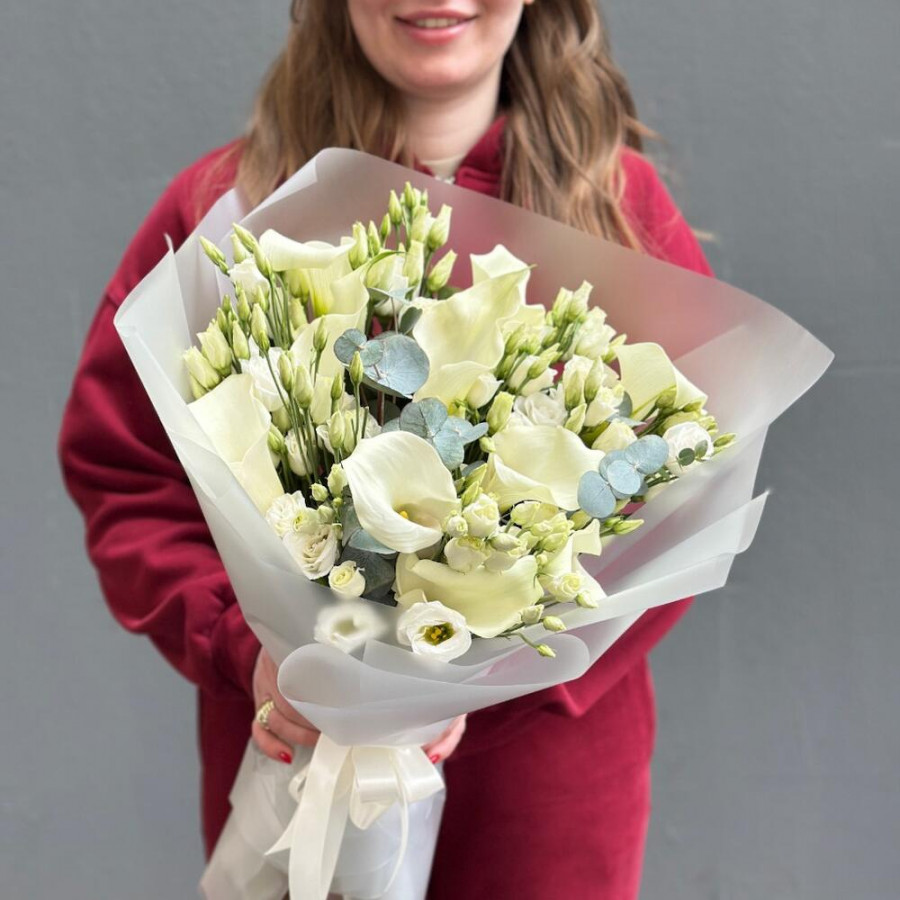 На фото букет из белых калл и эустом. В составе: эустома (лизиантус) 12 шт, калла 7 шт, дизайнерская упаковка 1 шт, атласная лента 1 шт, . Все цветы свежие и ароматные, букет красиво оформлен и отлично подходит для подарка. Доступна доставка цветов или самовывоз.