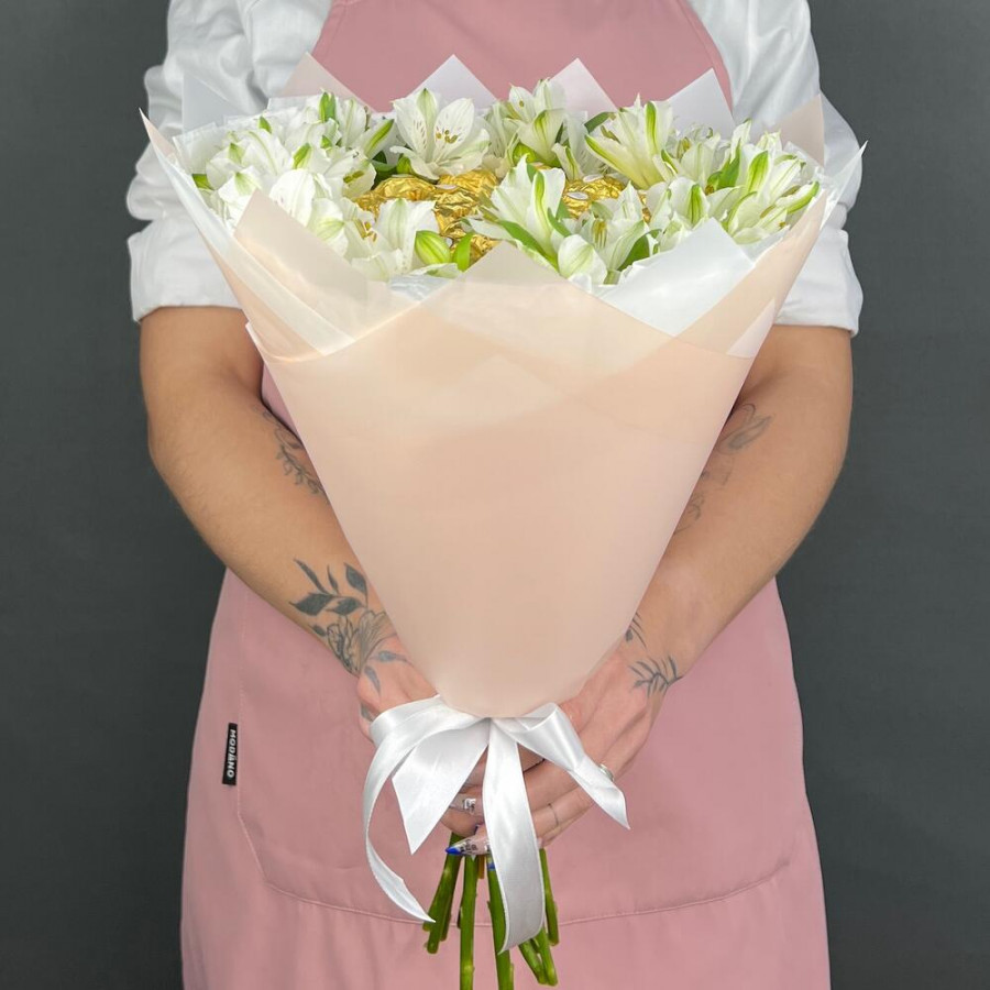 Букет из конфет Ferrero Rocher и и альстромерии