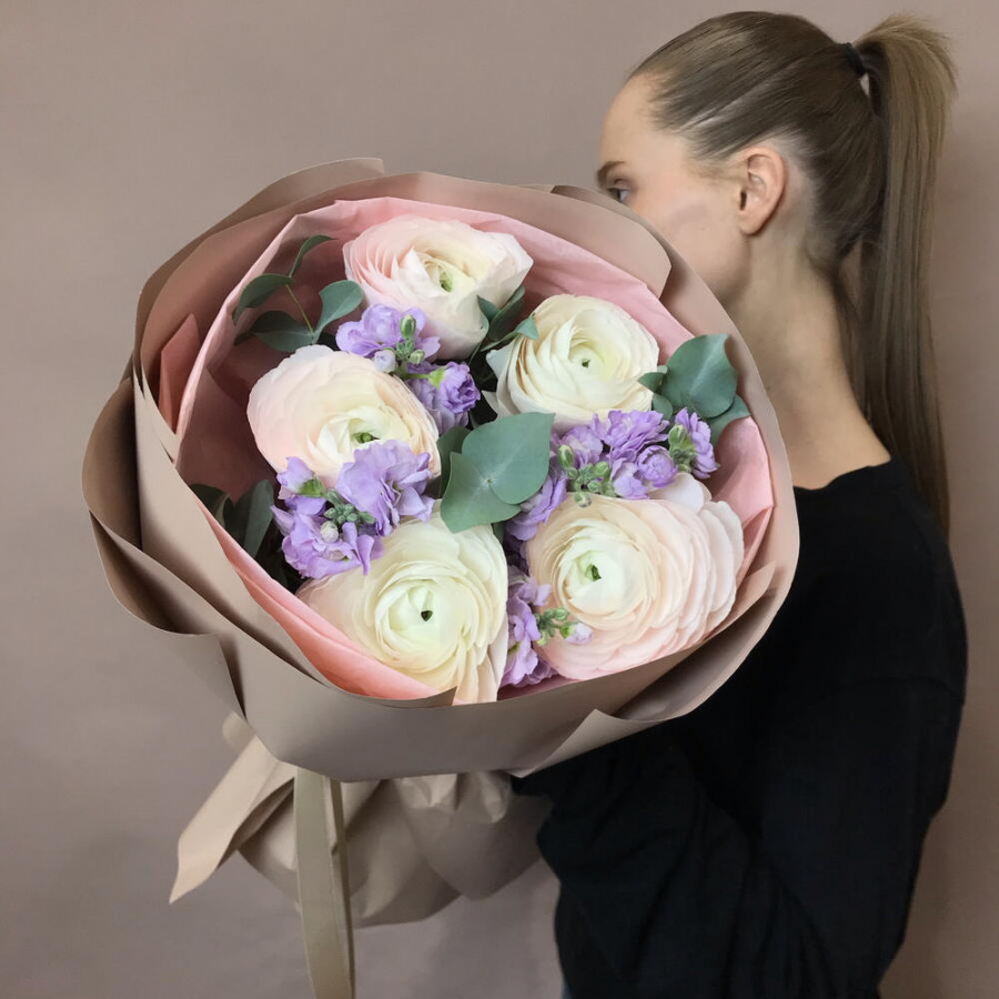 Букет из розовых ранункулюсов и сиреневой матиолы в Моршанске