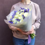 На фото букет из белых роз и синих ирисов. В составе: роза 15 шт, ирис 8 шт, дизайнерская упаковка 1 шт, атласная лента 1 шт, . Все цветы свежие и ароматные, букет красиво оформлен и отлично подходит для подарка. Доступна доставка цветов или самовывоз.