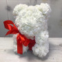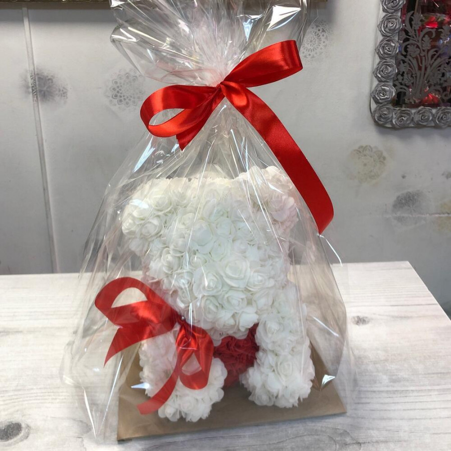 На фото мишка из роз белый. В составе: . Все цветы свежие и ароматные, букет красиво оформлен и отлично подходит для подарка. Доступна доставка цветов или самовывоз.